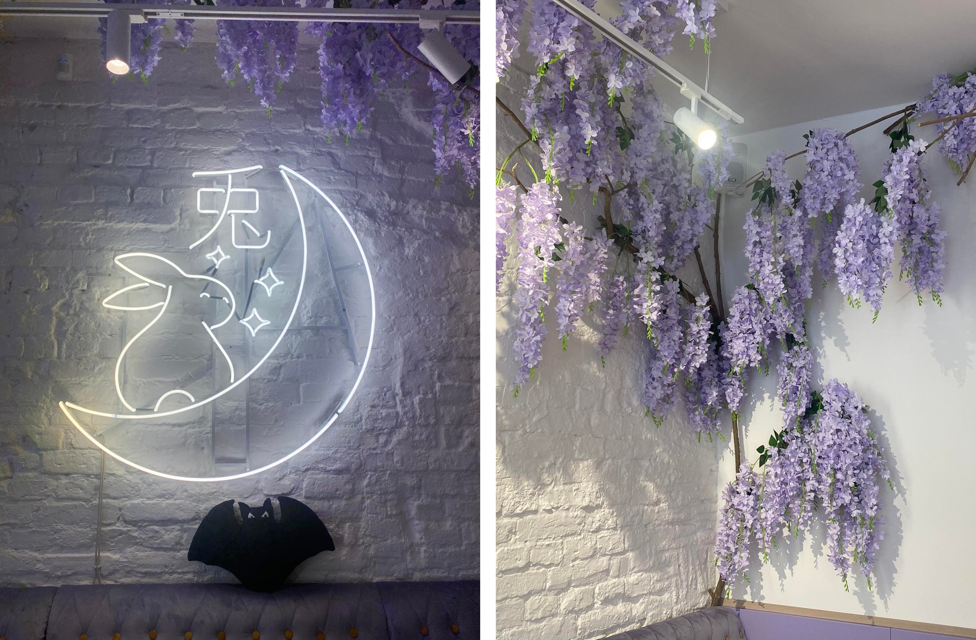 Wnętrze moim zdaniem jest cudowne. Zarówno podświetlany neon jak i słodkie grafiki nawiązują do mitu, że króliki mieszkają na księżycu. Jest spójne. Króluje drewno oraz fioletowy kolor. Można go znaleźć na ścianach i obiciach kanap oraz krzeseł, które swoją drogą są bardzo miękkie i wygodne. Wisienką na torcie jest wisząca wisteria. Uwielbiam takie detale. Nadają wnętrzu swoistego charakteru.